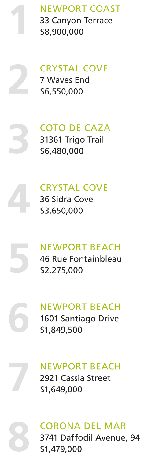 1 2 NEWPORT COAST 33 Canyon Terrace $8,900,000 CRYSTAL COVE 7 Waves End $6,550,000 3 COTO DE CAZA 31361 Trigo Trail $6,480,000 4 5 CRYSTAL COVE 36 Sidra Cove $3,650,000 NEWPORT BEACH 46 Rue Fontainbleau $2,275,000 6 7 NEWPORT BEACH 1601 Santiago Drive $1,849,500 NEWPORT BEACH 2921 Cassia Street $1,649,000 8 CORONA DEL MAR 3741 Daffodil Avenue, 94 $1,479,000