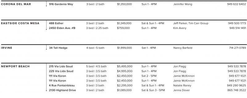 newport beach 215 Via lido Soud 5 bed | 4.5 bath $5,495,000 sun 1 - 4pm Jon Flagg 949 533 7878 225 Via lido Soud 3 bed | 3.5 bath $4,995,000 sun 1 - 4pm Jon Flagg 949 533 7878 111 Via Koron 3 bed | 3.5 bath $2,450,000 sat 2 - 5pm Jamie mcKinnon 949 677 1021 111 Via Koron 3 bed | 3.5 bath $2,450,000 sun 1 - 4pm Jamie mcKinnon 949 677 1021 4 Rue Fontainbleau 3 bed | 3 bath $2,295,000 sat & sun 1 - 4pm natalie raney 949 290 9625 2130 Highland Drive 3 bed | 2 bath $1,089,000 sat & sun 3 - 5pm Jenna dover 865 748 3522