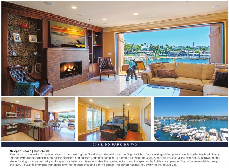 6 3 3 L I D O PA R K D R F - 3 Newport Beach | $2,450,000 Penthouse on the water. Straight on views of the sparkling bay, Saddleback Mountain and dazzling city lights. Disappearing, sliding glass doors bring the bay front directly into the living room! Sophisticated design elements and custom upgrades combine to create a luxurious life style. Amenities include: Viking appliances, hardwood and stone flooring, custom cabinetry and a spacious water front terrace to view the boating activity and the spectacular holiday boat parade. Boat slips are available through the HOA. Privacy is prioritized with gated entry to the residence and parking garage. An elevator carries you swiftly to the private villa.