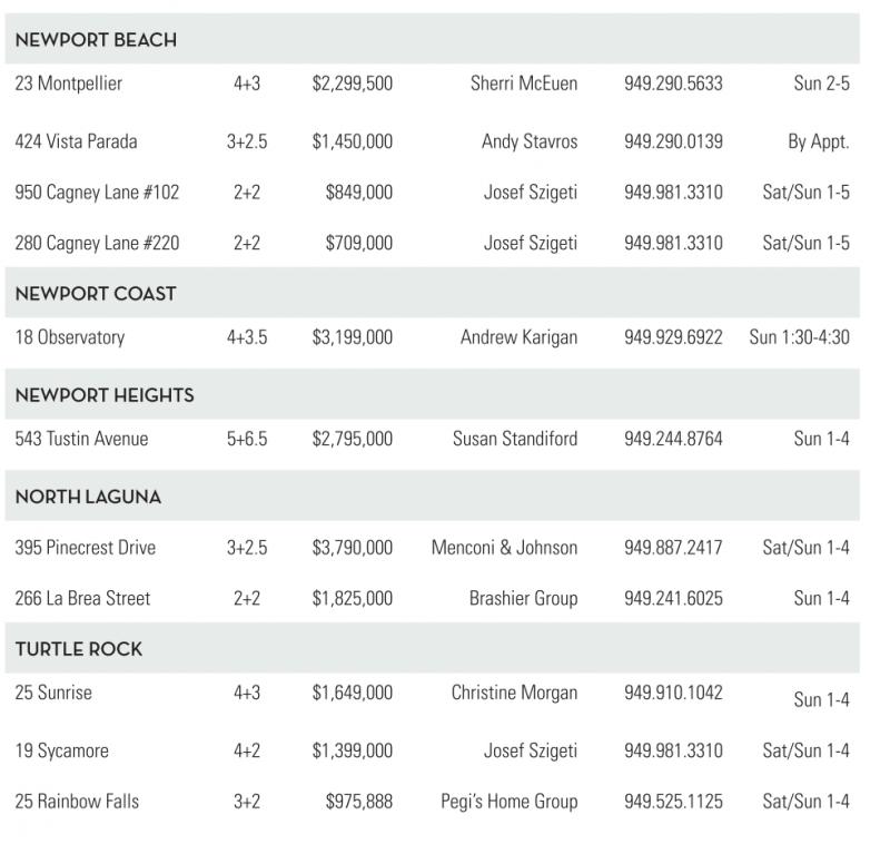 NEWPORTBEACH 23 Montpellier 4+3 $2,299,500 Sherri McEuen 949.290.5633 Sun 2-5 424 Vista Parada 3+2.5 $1,450,000 Andy Stavros 949.290.0139 By Appt. 950 Cagney Lane #102 2+2 $849,000 Josef Szigeti 949.981.3310 Sat/Sun 1-5 280 Cagney Lane #220 2+2 $709,000 Josef Szigeti 949.981.3310 Sat/Sun 1-5 NEWPORTCOAST 18 Observatory 4+3.5 $3,199,000 Andrew Karigan 949.929.6922 Sun 1:30-4:30 NEWPORTHEIGHTS 543 Tustin Avenue 5+6.5 $2,795,000 Susan Standiford 949.244.8764 Sun 1-4 NORTH GUNA 395 Pinecrest Drive 3+2.5 $3,790,000 Menconi &Johnson 949.887.2417 Sat/Sun 1-4 266 La Brea Street 2+2 $1,825,000 Brashier Group 949.241.6025 Sun 1-4 TURTLE ROCK 25 Sunrise 4+3 $1,649,000 Christine Morgan 949.910.1042 Sun 1-4 19 Sycamore 4+2 $1,399,000 Josef Szigeti 949.981.3310 Sat/Sun 1-4 25 Rainbow Falls 3+2 $975,888 Pegi’sHome Group 949.525.1125 Sat/Sun 1-4