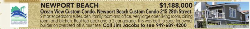 NEWPORT BEACH $1,188,000 Ocean View Custom Condo. Newport Beach Custom Condo-215 28th Street. 2 master bedroom suites, den, family room and office. Very large open living room, dining room and kitchen. Roof top deck and a 2 car garage. This was built to spec for owner builder on oversized lot! A must see! Call Jim Jacobs to see 949-689-4200