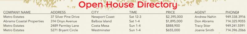COMPANY NAME ADDRESS CITY TIME PRICE AGENT PHONE# Metro Estates 37 Silver Pine Drive Newport Coast Sat 12-3 $2,395,000 Andrew Nahin 949.338.3916 Abrams Coastal Properties 314 Onyx Avenue Balboa Island Sat 1-4 $1,895,000 Don Abrams 714.325.9055 Metro Estates 2489 Parmley Lane Costa Mesa Sun 1-4 $888,900 Tracy Stier 949.241.5591 Metro Estates 5271 Bryant Circle Westminster Sun 1-4 $655,000 Joanie Smith 714.396.2066
