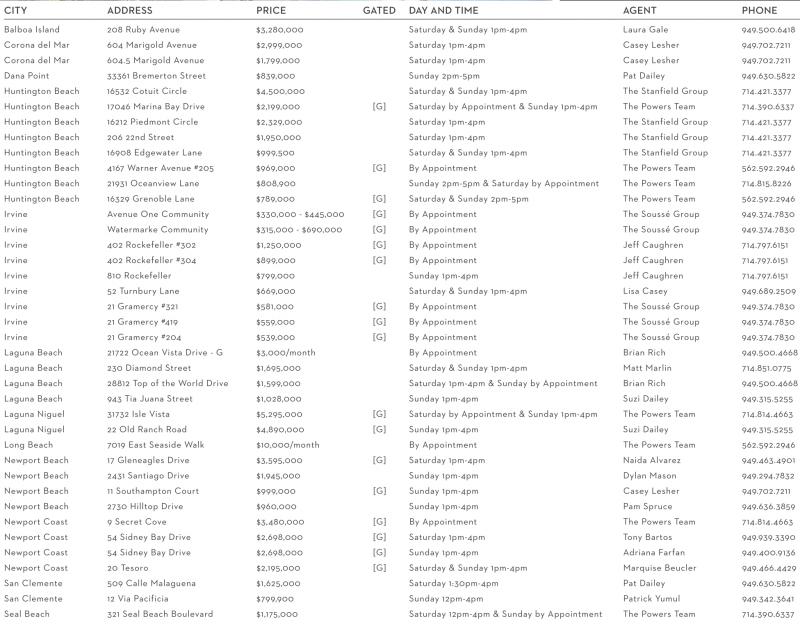 Balboa Island 208 Ruby Avenue $3,280,000 Saturday & Sunday 1pm-4pm Laura Gale 949.500.6418 Corona del Mar 604 Marigold Avenue $2,999,000 Saturday 1pm-4pm Casey Lesher 949.702.7211 Corona del Mar 604.5 Marigold Avenue $1,799,000 Saturday 1pm-4pm Casey Lesher 949.702.7211 Dana Point 33361 Bremerton Street $839,000 Sunday 2pm-5pm Pat Dailey 949.630.5822 Huntington Beach 16532 Cotuit Circle $4,500,000 Saturday & Sunday 1pm-4pm The Stanfield Group 714.421.3377 Huntington Beach 17046 Marina Bay Drive $2,199,000 [G] Saturday by Appointment & Sunday 1pm-4pm The Powers Team 714.390.6337 Huntington Beach 16212 Piedmont Circle $2,329,000 Saturday 1pm-4pm The Stanfield Group 714.421.3377 Huntington Beach 206 22nd Street $1,950,000 Saturday 1pm-4pm The Stanfield Group 714.421.3377 Huntington Beach 16908 Edgewater Lane $999,500 Saturday & Sunday 1pm-4pm The Stanfield Group 714.421.3377 Huntington Beach 4167 Warner Avenue #205 $969,000 [G] By Appointment The Powers Team 562.592.2946 Huntington Beach 21931 Oceanview Lane $808,900 Sunday 2pm-5pm & Saturday by Appointment The Powers Team 714.815.8226 Huntington Beach 16329 Grenoble Lane $789,000 [G] Saturday & Sunday 2pm-5pm The Powers Team 562.592.2946 Irvine Avenue One Community $330,000 - $445,000 [G] By Appointment The Soussé Group 949.374.7830 Irvine Watermarke Community $315,000 - $690,000 [G] By Appointment The Soussé Group 949.374.7830 Irvine 402 Rockefeller #302 $1,250,000 [G] By Appointment Jeff Caughren 714.797.6151 Irvine 402 Rockefeller #304 $899,000 [G] By Appointment Jeff Caughren 714.797.6151 Irvine 810 Rockefeller $799,000 Sunday 1pm-4pm Jeff Caughren 714.797.6151 Irvine 52 Turnbury Lane $669,000 Saturday & Sunday 1pm-4pm Lisa Casey 949.689.2509 Irvine 21 Gramercy #321 $581,000 [G] By Appointment The Soussé Group 949.374.7830 Irvine 21 Gramercy #419 $559,000 [G] By Appointment The Soussé Group 949.374.7830 Irvine 21 Gramercy #204 $539,000 [G] By Appointment The Soussé Group 949.374.7830 Laguna Beach 21722 Ocean Vista Drive - G $3,000/month By Appointment Brian Rich 949.500.4668 Laguna Beach 230 Diamond Street $1,695,000 Saturday & Sunday 1pm-4pm Matt Marlin 714.851.0775 Laguna Beach 28812 Top of the World Drive $1,599,000 Saturday 1pm-4pm & Sunday by Appointment Brian Rich 949.500.4668 Laguna Beach 943 Tia Juana Street $1,028,000 Sunday 1pm-4pm Suzi Dailey 949.315.5255 Laguna Niguel 31732 Isle Vista $5,295,000 [G] Saturday by Appointment & Sunday 1pm-4pm The Powers Team 714.814.4663 Laguna Niguel 22 Old Ranch Road $4,890,000 [G] Sunday 1pm-4pm Suzi Dailey 949.315.5255 Long Beach 7019 East Seaside Walk $10,000/month By Appointment The Powers Team 562.592.2946 Newport Beach 17 Gleneagles Drive $3,595,000 [G] Saturday 1pm-4pm Naida Alvarez 949.463.4901 Newport Beach 2431 Santiago Drive $1,945,000 Sunday 1pm-4pm Dylan Mason 949.294.7832 Newport Beach 11 Southampton Court $999,000 [G] Sunday 1pm-4pm Casey Lesher 949.702.7211 Newport Beach 2730 Hilltop Drive $960,000 Sunday 1pm-4pm Pam Spruce 949.636.3859 Newport Coast 9 Secret Cove $3,480,000 [G] By Appointment The Powers Team 714.814.4663 Newport Coast 54 Sidney Bay Drive $2,698,000 [G] Saturday 1pm-4pm Tony Bartos 949.939.3390 Newport Coast 54 Sidney Bay Drive $2,698,000 [G] Sunday 1pm-4pm Adriana Farfan 949.400.9136 Newport Coast 20 Tesoro $2,195,000 [G] Saturday & Sunday 1pm-4pm Marquise Beucler 949.466.4429 San Clemente 509 Calle Malaguena $1,625,000 Saturday 1:30pm-4pm Pat Dailey 949.630.5822 San Clemente 12 Via Pacificia $799,900 Sunday 12pm-4pm Patrick Yumul 949.342.3641 Seal Beach 321 Seal Beach Boulevard $1,175,000 Saturday 12pm-4pm & Sunday by Appointment The Powers Team 714.390.6337