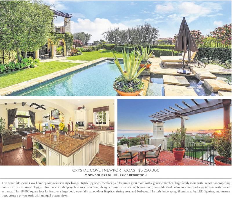 CRYSTAL COVE | NEWPORT COAST $5,250,000 2 GONDOLIERS BLUFF : PRICE REDUCTION This beautiful Crystal Cove home epitomizes resort style living. Highly upgraded, the floor plan features a great room with a gourmet kitchen, large family room with French doors opening onto an extensive covered loggia. This residence also plays host to a main floor library, exquisite master suite, bonus room, two additional bedroom suites, and a guest casita with private entrance. This 18,000 square foot lot features a large pool, waterfall spa, outdoor fireplace, sitting area, and barbecue. The lush landscaping, illuminated by LED lighting, and mature trees, create a private oasis with tranquil oceans views.
