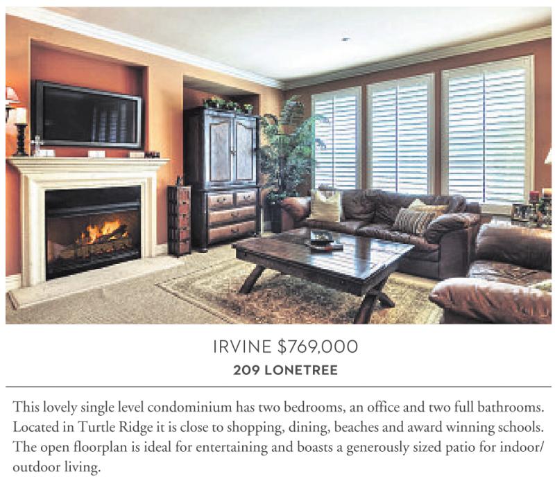 IRVINE $769,000 209 LONETREE This lovely single level condominium has two bedrooms, an office and two full bathrooms. Located in Turtle Ridge it is close to shopping, dining, beaches and award winning schools. The open floorplan is ideal for entertaining and boasts a generously sized patio for indoor/ outdoor living.