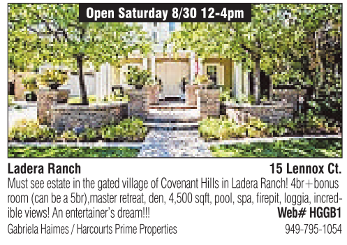 Open Saturday 8/30 12-4pm Ladera Ranch 15 Lennox Ct. Must see estate in the gated village of Covenant Hills in Ladera Ranch! 4br+bonus room (can be a5br),master retreat, den, 4,500 sqft, pool, spa, firepit, loggia, incredible views! An entertainer’s dream!!! Web# HGGB1 Gabriela Haimes /Harcourts Prime Properties 949-795-1054