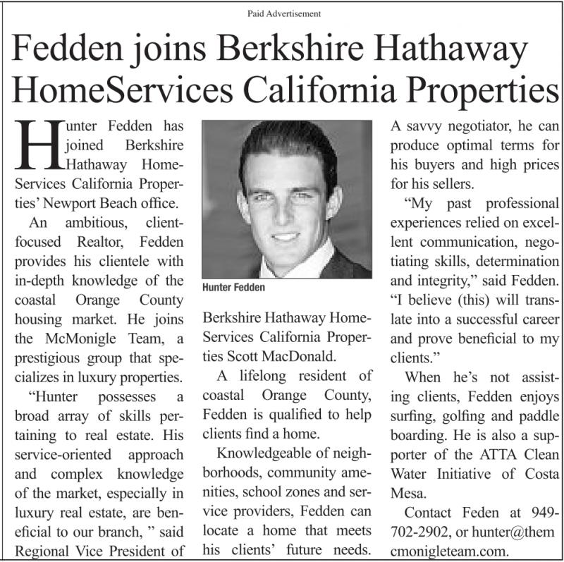 Fedden has joined Berkshire Hathaway Home- Services California Properties’ Newport Beach office.