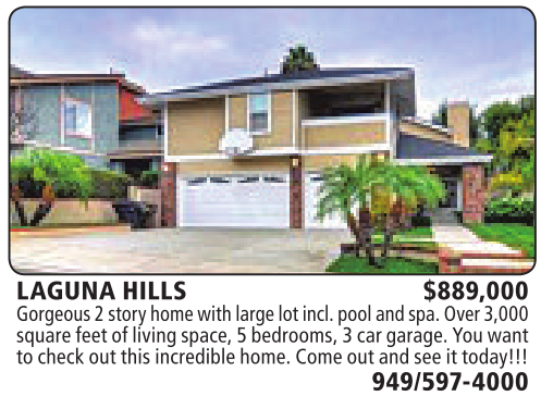 LAGUNA HILLS $889,000 Gorgeous 2story homewithlarge lotincl. pooland spa. Over 3,000 squarefeetofliving space, 5bedrooms, 3car garage. Youwant to check outthis incredible home.Come outand seeittoday!!!
