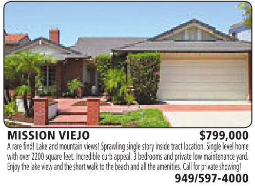 MISSION VIEJO $799,000 Arare find! Lake and mountain views! Sprawling single story inside tract location. Single level home with over 2200 square feet. Incredible curb appeal. 3bedrooms and private low maintenance yard. Enjoy thelakeviewand theshortwalk to thebeachand allthe amenities. Call for private showing! 949/597-4000 See also