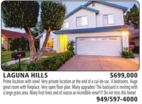 LAGUNA HILLS $699,000 Prime location with view! Very private location at the end of acul-de-sac. 4bedrooms. Huge great room with fireplace. Very open floor plan. Many upgrades! The backyard is inviting with alarge grassarea. Manyfruit trees andofcourse an incredible view!!!! Do notmissthis home! 949/597-4000 See also