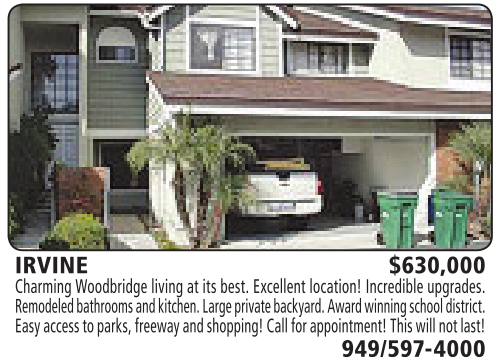 IRVINE $630,000 Charming Woodbridge living at its best. Excellent location! Incredible upgrades. Remodeledbathrooms andkitchen. Large privatebackyard. Awardwinningschool district. Easy access to parks, freeway andshopping! Call for appointment! This will notlast! 949/597-4000 See also