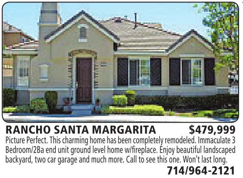 RANCHO SANTA MARGARITA $479,999 PicturePerfect.This charminghome hasbeencompletelyremodeled. Immaculate3 Bedroom/2Baend unit groundlevel home w/fireplace.Enjoy beautifullandscaped backyard,two cargarageand muchmore.Calltosee this one.Won’t last long. 714/964-2121 See also
