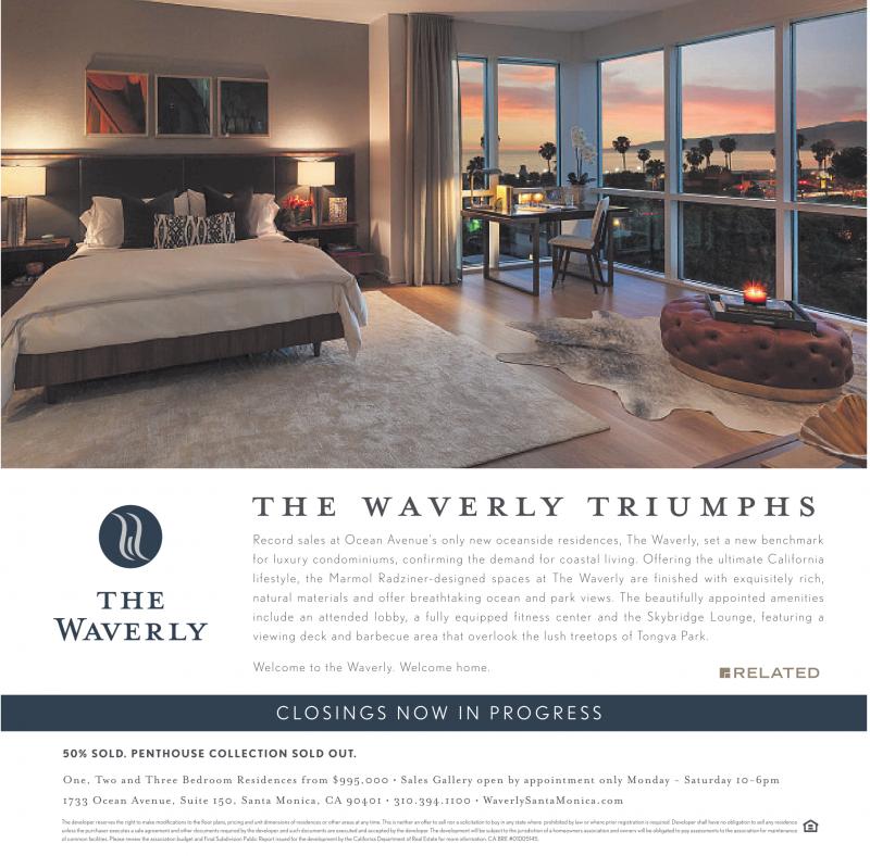 Record sales at Ocean Avenue’s only new oceanside residences, The Waverly, set a new benchmark for luxury condominiums, confirming the demand for coastal living. Offering the ultimate California lifestyle, the Marmol Radziner-designed spaces at The Waverly are finished with exquisitely rich, natural materials and offer breathtaking ocean and park views. The beautifully appointed amenities include an attended lobby, a fully equipped fitness center and the Skybridge Lounge, featuring a viewing deck and barbecue area that overlook the lush treetops of Tongva Park.