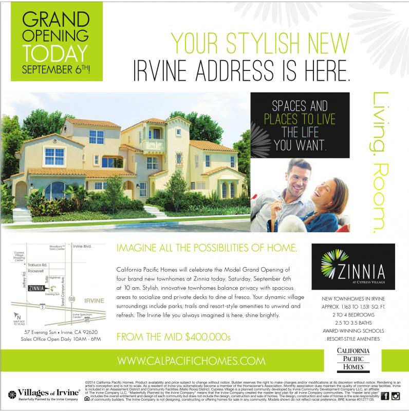 ©2014 California Pacific Homes. Product availability and price subject to change without notice. Builder reserves the right to make changes and/or modifications at its discretion without notice. Rendering is an artist’s conception and is not to scale. As aresident of Irvine you automatically become amember of the Homeowner’s Association. Monthly association dues maintain the quality of common area facilities. Irvine is included in an Assessment District and Community Facilities (Mello Roos) District. Cypress Village is aplanned community developed by Irvine Community Development Company LLC, an affiliate of The Irvine Company LLC. “Masterfully Planned by the Irvine Company” means that the Irvine Company created the master land plan for all Irvine Company communities. The “master land plan” includes the overall entitlement and design of each community but does not include the design, construction and sale of homes. The design, construction and sale of homes is the sole responsibility of community builders. The Irvine Company is not designing, constructing or offering homes for sale in any community. Models shown do not reflect racial preference. BRE license #01277135.