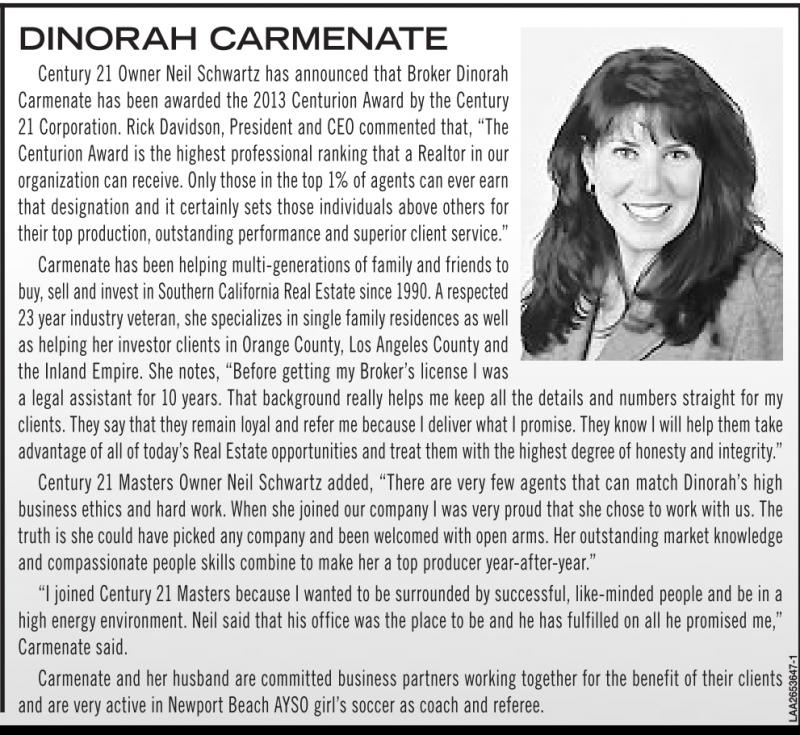 DINORAH CARMENATE Century 21 Owner Neil Schwartz has announced that Broker Dinorah Carmenate has been awarded the 2013 Centurion Award by the Century 21 Corporation. Rick Davidson, President and CEO commented that, “The Centurion Award is the highest professional ranking that a Realtor in our organization canreceive.Onlythose in thetop 1% of agents canever earn that designation and it certainly sets those individuals above others for theirtop production,outstandingperformance andsuperiorclientservice.” Carmenatehas been helpingmulti-generationsoffamilyand friends to buy, sell andinvestinSouthernCalifornia Real Estate since1990. Arespected 23 year industry veteran, shespecializes in single family residencesaswell as helping her investor clients in Orange County, Los Angeles County and the Inland Empire. She notes, “Before getting my Broker’s license I was a legal assistant for 10 years. That background really helps me keep all the details and numbers straight for my clients.Theysay that they remainloyal andrefer me becauseIdeliverwhatIpromise. They know Iwill help them take advantageofall of today’sRealEstate opportunitiesand treatthemwiththe highestdegree of honestyand integrity.” Century 21 Masters Owner Neil Schwartz added, “There are very few agents that can match Dinorah’s high business ethics and hard work. When she joined our company I was very proud that she chose to work with us. The truthisshe couldhavepickedany companyand been welcomedwithopenarms. Heroutstandingmarketknowledge and compassionate people skills combine to make her a top producer year-after-year.” “I joined Century 21 Masters because I wanted to be surrounded by successful, like-minded people and be in a high energy environment. Neil said that his office was the place to be and he has fulfilled on all he promised me,” Carmenate said. Carmenate and her husband are committed business partners working together for the benefit of their clients and are very active in Newport Beach AYSO girl’s soccer as coach and referee.