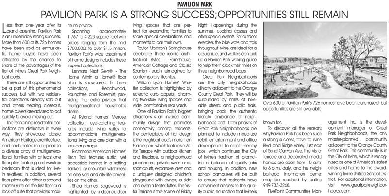 More than 600 of its 726 homes have been sold as enthusiastic home buyers have been attracted by the chance to share all the advantages of the first of Irvine’s Great Park Neighborhoods.