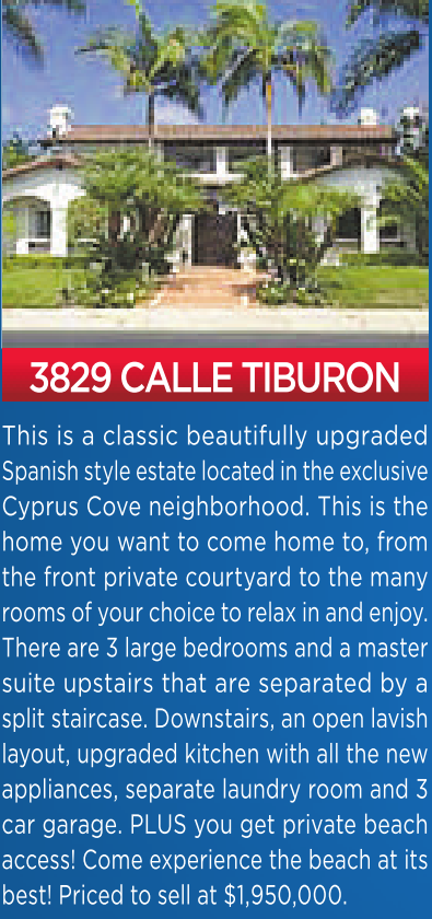 This is a classic beautifully upgraded Spanish style estate located inthe exclusive Cyprus Cove neighborhood. This is the home you want to come home to, from the front private courtyard to the many rooms ofyour choice torelax in and enjoy. There are 3 large bedrooms and a master suite upstairs that are separated by a split staircase. Downstairs, an open lavish layout, upgraded kitchen with all the new appliances, separate laundry room and 3 car garage. PLUS you get private beach access! Come experience the beach at its best! Priced to sell at $1,950,000.