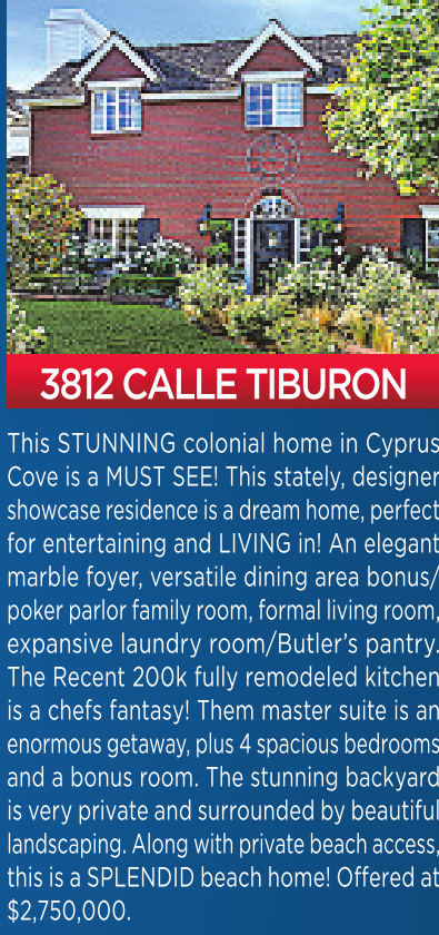 $2,750,000. 3812 CALLE TIBURON This STUNNING colonial home in Cyprus Cove is a MUST SEE! This stately, designer showcase residence is adream home, perfect for entertaining and LIVING in! An elegant marble foyer, versatile dining area bonus/ poker parlor family room, formal living room, expansive laundry room/Butler’s pantry. The Recent 200k fully remodeled kitchen is a chefs fantasy! Them master suite is an enormous getaway, plus 4spaciousbedrooms and a bonus room. The stunning backyard is very private and surrounded by beautiful landscaping. Along with private beach access, this is aSPLENDID beach home! Offered at