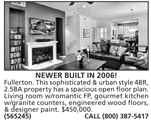 NEWER BUILT IN 2006! Fullerton. This sophisticated&urban style4BR, 2.5BApropertyhas aspaciousopenfloorplan. Living room w/romantic FP, gourmet kitchen w/granite counters, engineered wood floors, & designer paint. $450,000. (565245) CALL (800) 387-5417