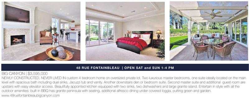 BIG CANYON | $3,595,000 NEWLY CONSTRUCTED, NEVER LIVED IN custom 4 bedroom home on oversized private lot. Two luxurious master bedrooms, one suite ideally located on the main level with spacious bath including dual sinks, Jacuzzi tub and vanity. Another downstairs den or bedroom suite. Second master suite and additional guest room are upstairs with easy elevator access. Beautifully appointed kitchen equipped with two sinks, two dishwashers and large granite island. Entertain in style with all the outdoor amenities: built-in BBQ has granite peninsula with seating, additional alfresco dining under covered loggia, putting green and garden. www.48ruefontainbleaubigcanyon.com