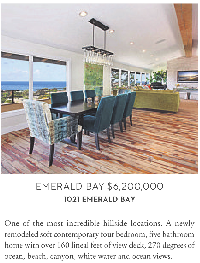 EMERALD BAY $6,200,000 1021 EMERALD BAY One of the most incredible hillside locations. A newly remodeled soft contemporary four bedroom, five bathroom home with over 160 lineal feet of view deck, 270 degrees of ocean, beach, canyon, white water and ocean views.