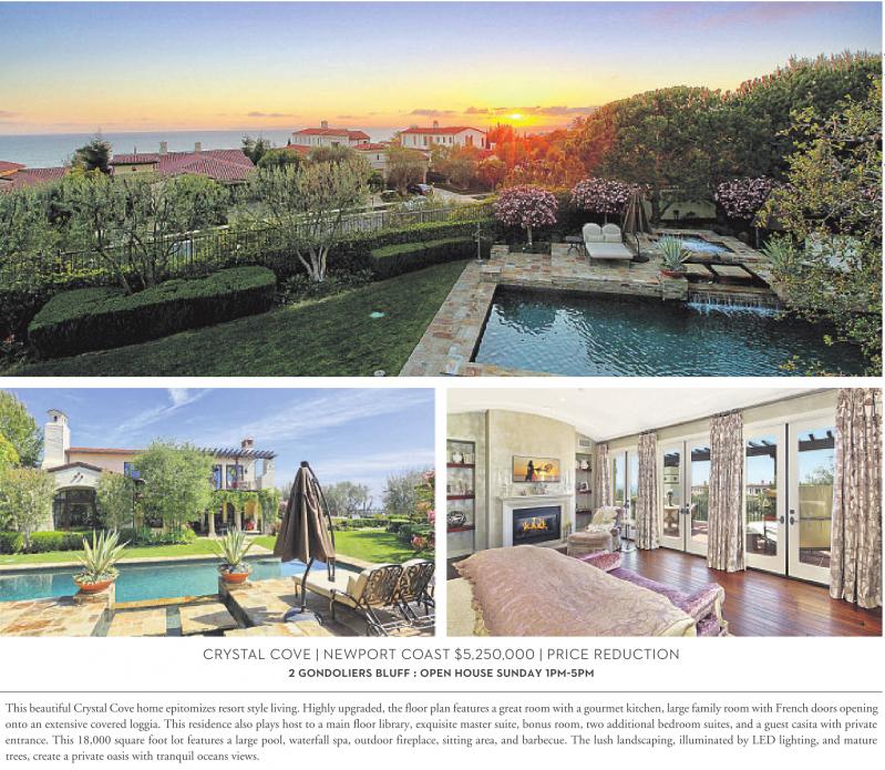 CRYSTAL COVE | NEWPORT COAST $5,250,000 | PRICE REDUCTION 2 GONDOLIERS BLUFF : OPEN HOUSE SUNDAY 1PM-5PM This beautiful Crystal Cove home epitomizes resort style living. Highly upgraded, the floor plan features a great room with a gourmet kitchen, large family room with French doors opening onto an extensive covered loggia. This residence also plays host to a main floor library, exquisite master suite, bonus room, two additional bedroom suites, and a guest casita with private entrance. This 18,000 square foot lot features a large pool, waterfall spa, outdoor fireplace, sitting area, and barbecue. The lush landscaping, illuminated by LED lighting, and mature trees, create a private oasis with tranquil oceans views.