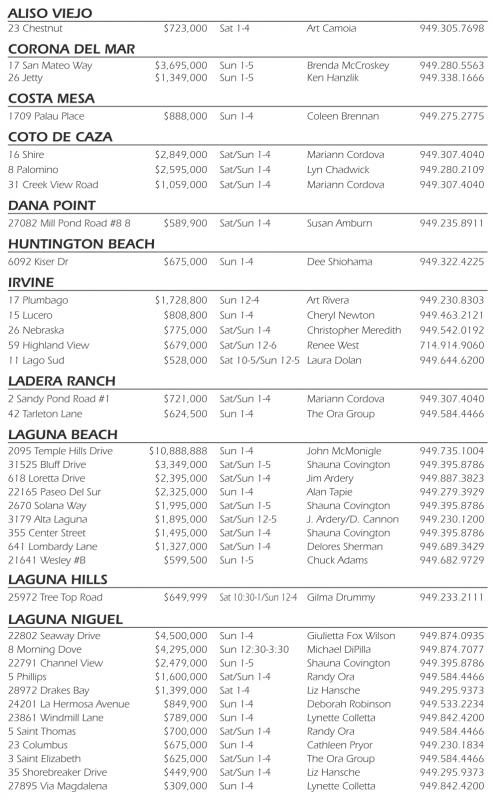 22802 Seaway Drive $4,500,000 Sun 1-4 Giulietta Fox Wilson 949.874.0935 8 Morning Dove $4,295,000 Sun 12:30-3:30 Michael DiPilla 949.874.7077 22791 Channel View $2,479,000 Sun 1-5 Shauna Covington 949.395.8786 5 Phillips $1,600,000 Sat/Sun 1-4 Randy Ora 949.584.4466 28972 Drakes Bay $1,399,000 Sat 1-4 Liz Hansche 949.295.9373 24201 La Hermosa Avenue $849,900 Sun 1-4 Deborah Robinson 949.533.2234 23861 Windmill Lane $789,000 Sun 1-4 Lynette Colletta 949.842.4200 5 Saint Thomas $700,000 Sat/Sun 1-4 Randy Ora 949.584.4466 23 Columbus $675,000 Sun 1-4 Cathleen Pryor 949.230.1834 3 Saint Elizabeth $625,000 Sat/Sun 1-4 The Ora Group 949.584.4466 35 Shorebreaker Drive $449,900 Sat/Sun 1-4 Liz Hansche 949.295.9373 27895 Via Magdalena $309,000 Sun 1-4 Lynette Colletta 949.842.4200