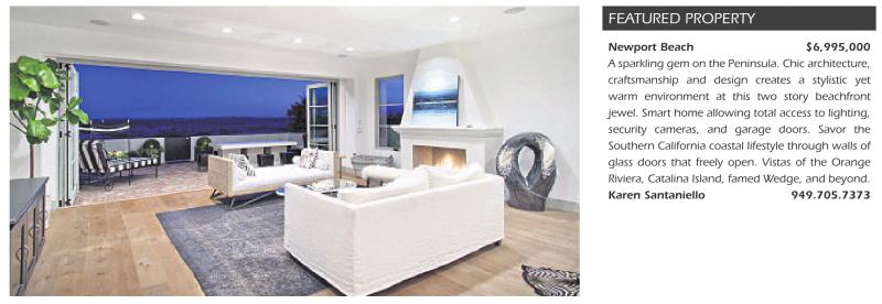 Newport Beach $6,995,000 A sparkling gem on the Peninsula. Chic architecture, craftsmanship and design creates a stylistic yet warm environment at this two story beachfront jewel. Smart home allowing total access to lighting, security cameras, and garage doors. Savor the Southern California coastal lifestyle through walls of glass doors that freely open. Vistas of the Orange Riviera, Catalina Island, famed Wedge, and beyond. Karen Santaniello 949.705.7373