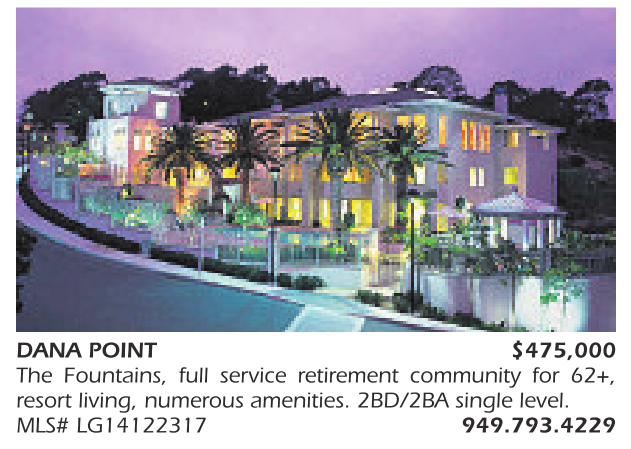 DANA POINT $475,000 The Fountains, full service retirement community for 62+, resort living, numerous amenities. 2BD/2BA single level. MLS# LG14122317 949.793.4229