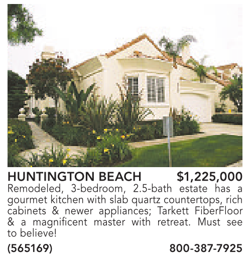 HUNTINGTON BEACH $1,225,000 Remodeled, 3-bedroom, 2.5-bath estate has a gourmet kitchen with slab quartz countertops, rich cabinets & newer appliances; Tarkett FiberFloor & a magnificent master with retreat. Must see to believe!
