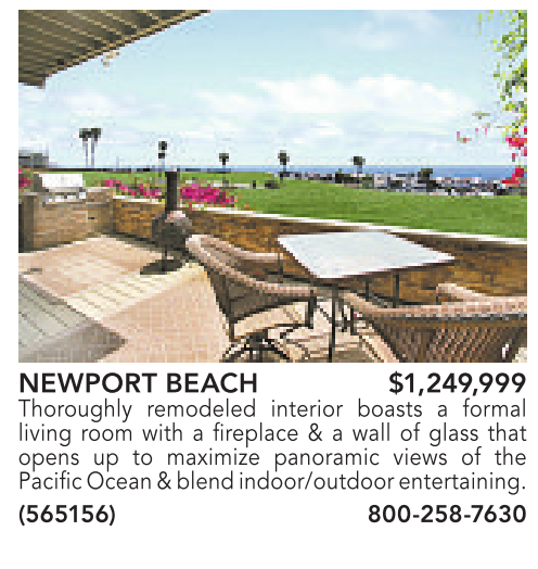 NEWPORT BEACH $1,249,999 Thoroughly remodeled interior boasts a formal living room with a fireplace & a wall of glass that opens up to maximize panoramic views of the Pacific Ocean &blend indoor/outdoor entertaining. (565156) 800-258-7630