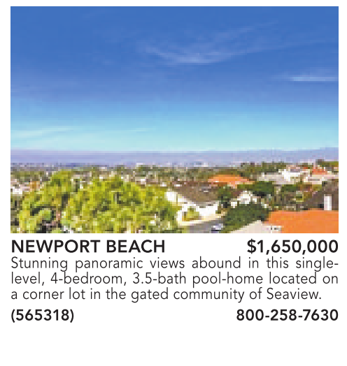 NEWPORT BEACH $1,650,000 Stunning panoramic views abound in this singlelevel, 4-bedroom, 3.5-bath pool-home located on a corner lot in the gated community of Seaview.