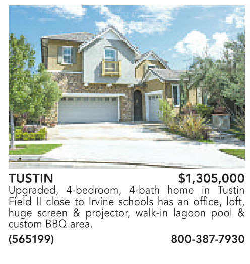 TUSTIN $1,305,000 Upgraded, 4-bedroom, 4-bath home in Tustin Field II close to Irvine schools has an office, loft, huge screen & projector, walk-in lagoon pool & custom BBQ area. (565199) 800-387-7930