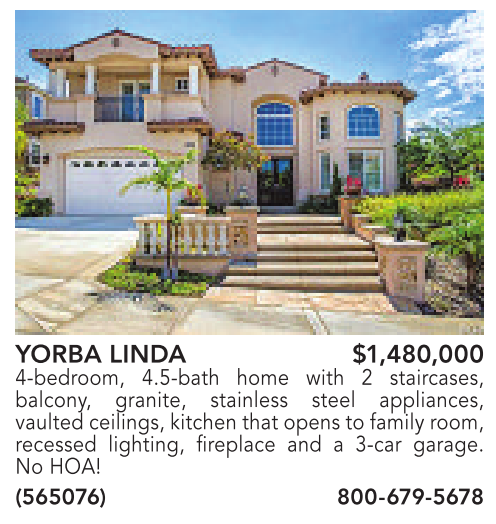 YORBA LINDA $1,480,000 4-bedroom, 4.5-bath home with 2 staircases, balcony, granite, stainless steel appliances, vaulted ceilings, kitchen that opens to family room, recessed lighting, fireplace and a 3-car garage. No HOA! (565076) 800-679-5678