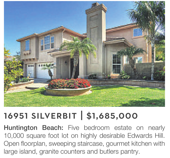 Huntington Beach: Five bedroom estate on nearly 10,000 square foot lot on highly desirable Edwards Hill. Open floorplan, sweeping staircase, gourmet kitchen with large island, granite counters and butlers pantry.