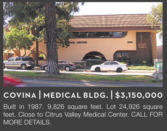 Built in 1987. 9,826 square feet. Lot 24,926 square feet. Close to Citrus Valley Medical Center. CALL FOR MORE DETAILS.