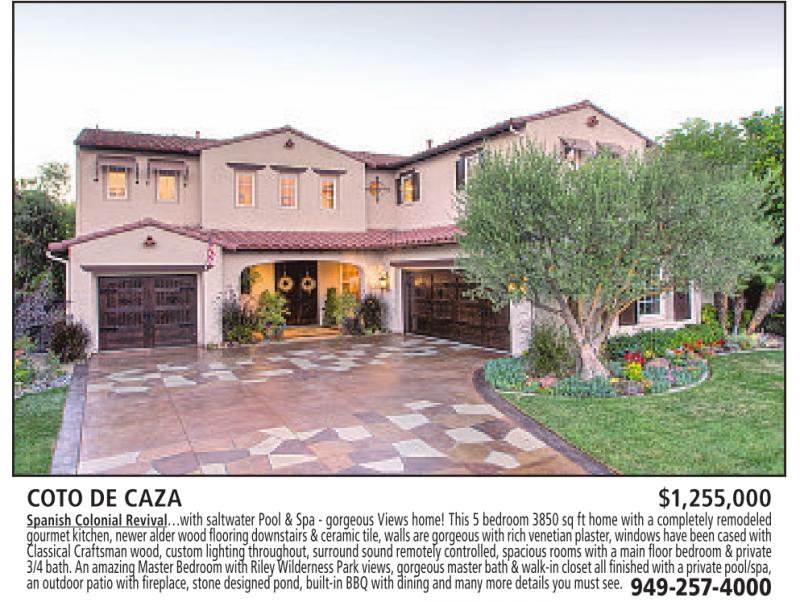 COTO DE CAZA $1,255,000 Spanish Colonial Revival…with saltwater Pool &Spa -gorgeous Views home! This 5bedroom 3850 sqfthome with acompletely remodeled gourmet kitchen,newer alderwood flooring downstairs&ceramic tile,walls aregorgeous with rich venetian plaster, windowshave beencased with ClassicalCraftsmanwood,customlightingthroughout, surroundsoundremotelycontrolled, spacious roomswithamain floorbedroom&private 3/4bath. An amazingMasterBedroomwithRiley Wilderness Park views, gorgeous masterbath&walk-inclosetall finished with aprivatepool/spa, an outdoorpatio with fireplace,stone designedpond,built-inBBQ with diningand many more detailsyou mustsee. 949-257-4000
