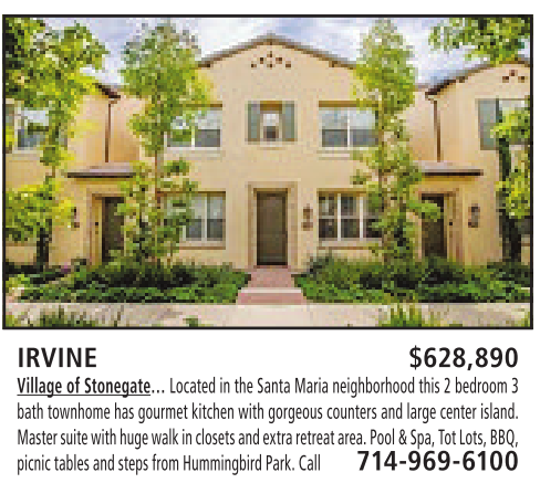 IRVINE $628,890 Village of Stonegate… Located in the Santa Maria neighborhood this 2bedroom 3 bath townhome has gourmet kitchen with gorgeous counters and large center island. Master suite with huge walkinclosetsand extraretreatarea. Pool &Spa,Tot Lots,BBQ, picnic tablesand stepsfrom HummingbirdPark. Call 714-969-6100