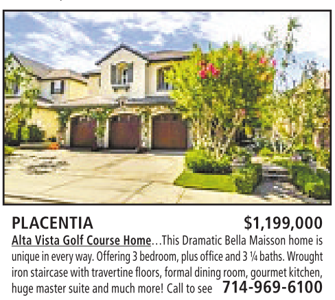 PLACENTIA $1,199,000 Alta Vista Golf Course Home…This Dramatic Bella Maisson home is unique in everyway.Offering 3bedroom, plus officeand 3¼baths.Wrought iron staircase with travertinefloors,formal diningroom, gourmet kitchen, huge mastersuiteand muchmore!Calltosee 714-969-6100