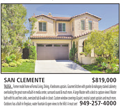 SAN CLEMENTE $819,000 TALEGA... Former model homew/Formal Living,Dining, 4bedrooms upstairs. Gourmet kitchen with granite &mahoganystained cabinetry