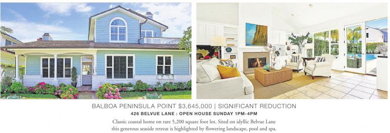 BALBOA PENINSULA POINT $3,645,000 | SIGNIFICANT REDUCTION 426 BELVUE LANE : OPEN HOUSE SUNDAY 1PM-4PM Classic coastal home on rare 5,200 square foot lot. Sited on idyllic Belvue Lane this generous seaside retreat is highlighted by flowering landscape, pool and spa.