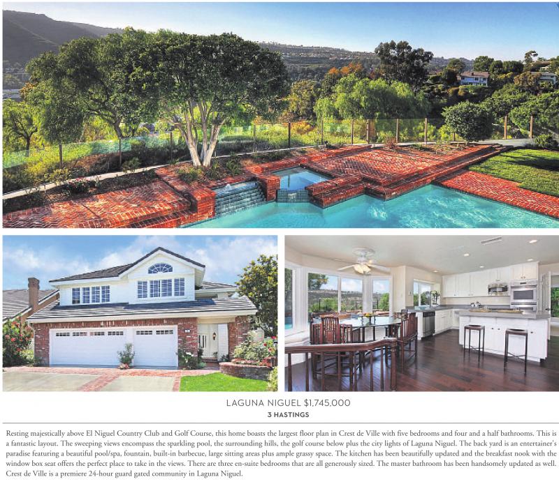LAGUNA NIGUEL $1,745,000 3 HASTINGS Resting majestically above El Niguel Country Club and Golf Course, this home boasts the largest floor plan in Crest de Ville with five bedrooms and four and a half bathrooms. This is a fantastic layout. The sweeping views encompass the sparkling pool, the surrounding hills, the golf course below plus the city lights of Laguna Niguel. The back yard is an entertainer's paradise featuring a beautiful pool/spa, fountain, built-in barbecue, large sitting areas plus ample grassy space. The kitchen has been beautifully updated and the breakfast nook with the window box seat offers the perfect place to take in the views. There are three en-suite bedrooms that are all generously sized. The master bathroom has been handsomely updated as well. Crest de Ville is a premiere 24-hour guard gated community in Laguna Niguel.