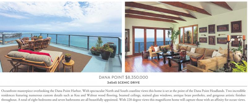 DANA POINT $8,350,000 34545 SCENIC DRIVE Oceanfront masterpiece overlooking the Dana Point Harbor. With spectacular North and South coastline views this home is set at the point of the Dana Point Headlands. Two incredible residences featuring numerous custom details such as Koa and Walnut wood flooring, beamed ceilings, stained glass windows, antique brass portholes, and gorgeous artistic finishes throughout. A total of eight bedrooms and seven bathrooms are all beautifully appointed. With 220 degree views this magnificent home will capture those with an affinity for ocean views.