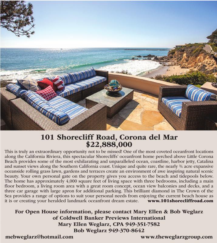 101 Shorecliff Road, Corona del Mar $22,888,000 This is truly an extraordinary opportunity not to be missed! One of the most coveted oceanfront locations along the California Riviera, this spectacular Shorecliffs’ oceanfront home perched above Little Corona Beach provides some of the most exhilarating and unparalleled ocean, coastline, harbor jetty, Catalina and sunset views along the Southern California coast. Unique and quite rare, the nearly ¾ acre expansive oceanside rolling grass lawn, gardens and terraces create an environment of awe inspiring natural scenic beauty. Your own personal gate on the property gives you access to the beach and tidepools below. The home has approximately 4,000 square feet of living space with three bedrooms, including a main floor bedroom, a living room area with a great room concept, ocean view balconies and decks, and athree car garage with large apron for additional parking. This brilliant diamond in The Crown of the Sea provides a range of options to suit your personal needs from enjoying the current beach house as it is or creating your heralded landmark oceanfront dream estate. www.101shorecliffroad.com For Open House information, please contact Mary Ellen & Bob Weglarz of Coldwell Banker Previews International Mary Ellen Weglarz, CPA 949-351-7582 Bob Weglarz 949-370-8642 mebweglarz@hotmail.com www.theweglarzgroup.com
