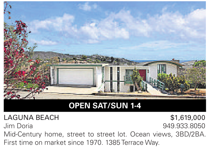 LAGUNA BEACH $1,619,000 Jim Doria 949.933.8050 Mid-Century home, street to street lot. Ocean views, 3BD/2BA. First time on market since 1970. 1385 Terrace Way.