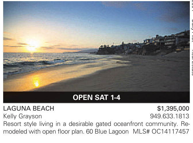 LAGUNA BEACH $1,395,000 Kelly Grayson 949.633.1813 Resort style living in a desirable gated oceanfront community. Remodeled with open floor plan. 60 Blue Lagoon MLS# OC14117457