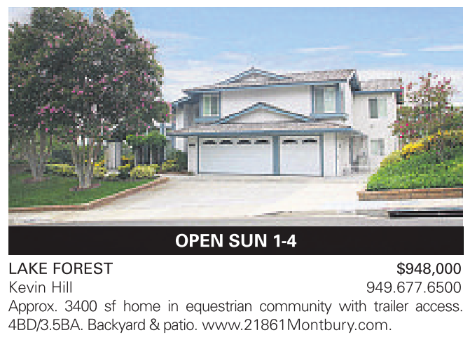 LAKE FOREST $948,000 Kevin Hill 949.677.6500 Approx. 3400 sf home in equestrian community with trailer access. 4BD/3.5BA. Backyard &patio. www.21861Montbury.com.