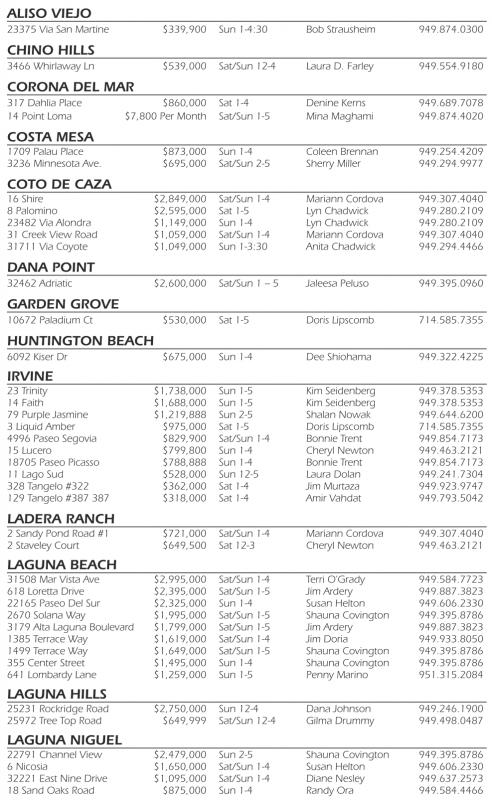317 Dahlia Place $860,000 Sat 1-4 Denine Kerns 949.689.7078 14 Point Loma $7,800 Per Month Sat/Sun 1-5 Mina Maghami 949.874.4020