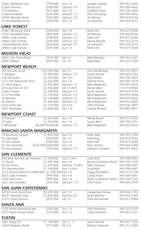 23861 Windmill Lane $749,000 Sun 1-4 Lynette Colletta 949.842.4200 5 Saint Thomas $700,000 Sat/Sun 1-4 Randy Ora 949.584.4466 23 Columbus $675,000 Sun 1-4 Cathleen Pryor 949.230.1834 3 Saint Elizabeth $625,000 Sat/Sun 1-4 The Ora Group 949.584.4466 24905 Mansilla Street $625,000 Sat/Sun 1-5 Jim Bishop 949.464.8136 35 Shorebreaker Drive $439,900 Sun 1-4 Liz Hansche 949.295.9373