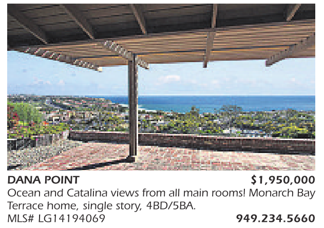 DANA POINT $1,950,000 Ocean and Catalina views from all main rooms! Monarch Bay Terrace home, single story, 4BD/5BA. MLS# LG14194069 949.234.5660